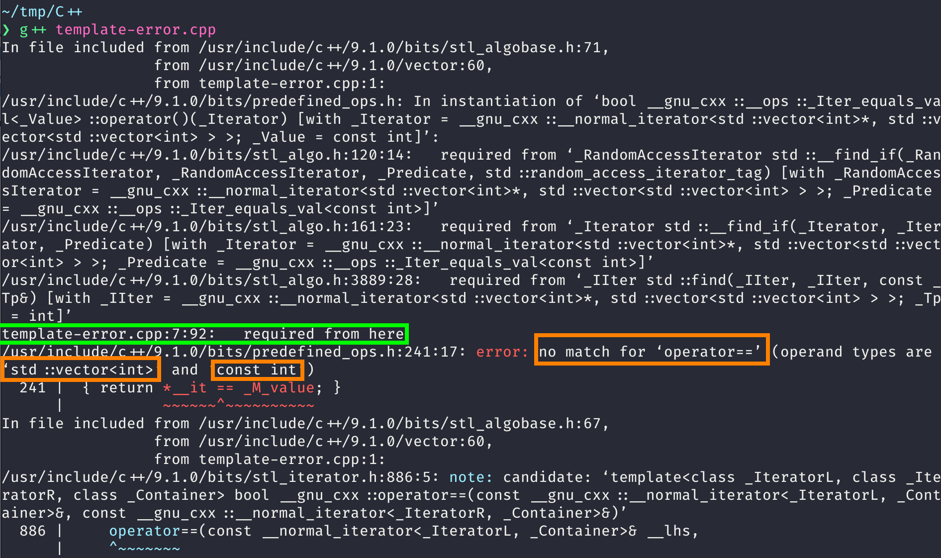 far. For example, in g++ 9, the error might say problem1.cpp:9:92: required from here. Once you’ve found this, go to your source code and look